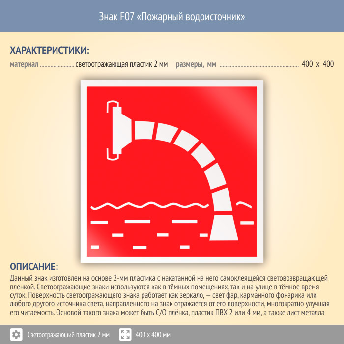 Знак F07 «Пожарный водоисточник» (светоотражающий пластик, 400х400 мм) в Хотьково купить