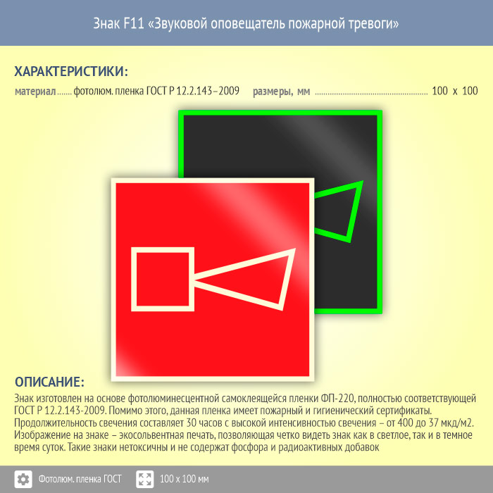 Знак F11 «Звуковой оповещатель пожарной тревоги» (фотолюминесцентная пленка ГОСТ 34428-2018, 100х100 мм) в Хотьково купить