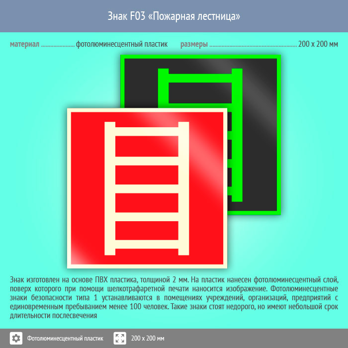 Знак F03 «Пожарная лестница» (фотолюминесцентный пластик, 200х200 мм) в Хотьково купить