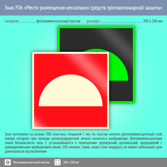Знак F06 «Место размещения нескольких средств противопожарной защиты» (фотолюминесцентный пластик, 200х200 мм) в Хотьково купить