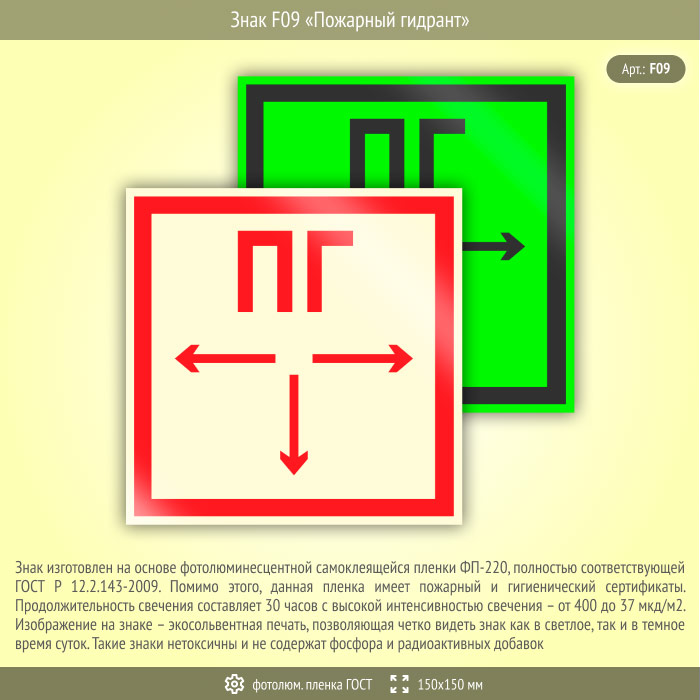 Знак F09 «Пожарный гидрант» (фотолюминесцентная пленка ГОСТ 34428-2018, 150х150 мм) в Хотьково купить