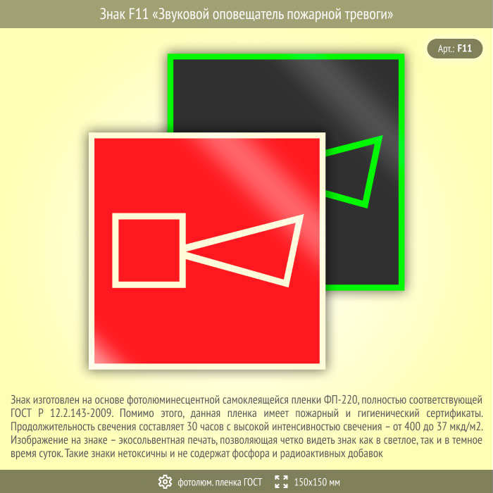 Знак F11 «Звуковой оповещатель пожарной тревоги» (фотолюминесцентная пленка ГОСТ 34428-2018, 150х150 мм) в Хотьково купить