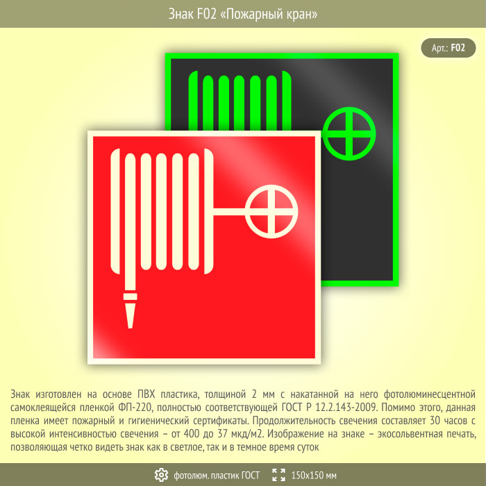 Знак F02 «Пожарный кран» (фотолюминесцентный пластик ГОСТ 34428-2018, 150х150 мм) в Хотьково купить