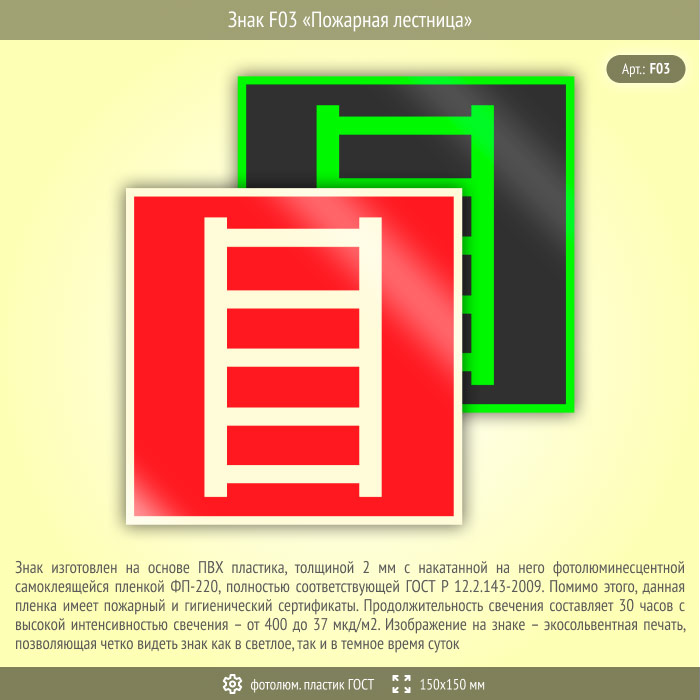 Знак F03 «Пожарная лестница» (фотолюминесцентный пластик ГОСТ 34428-2018, 150х150 мм) в Хотьково купить