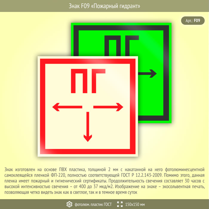 Знак F09 «Пожарный гидрант» (фотолюминесцентный пластик ГОСТ 34428-2018, 150х150 мм) в Хотьково купить