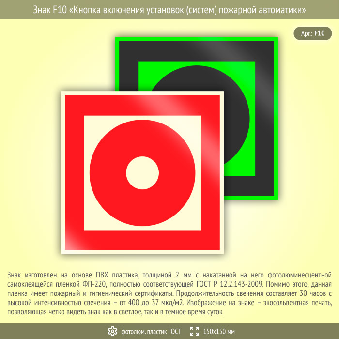 Знак F10 «Кнопка включения установок (систем) пожарной автоматики» (фотолюминесцентный пластик ГОСТ 34428-2018, 150х150 мм) в Хотьково купить
