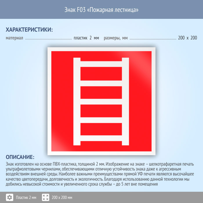 Знак F03 «Пожарная лестница» (пластик, 200х200 мм) в Хотьково купить