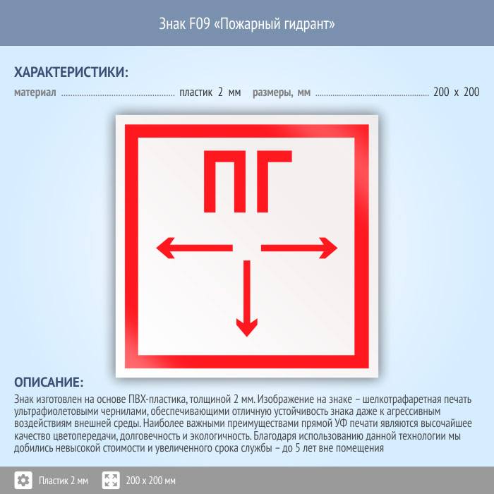 Знак F09 «Пожарный гидрант» (пластик, 200х200 мм) в Хотьково купить