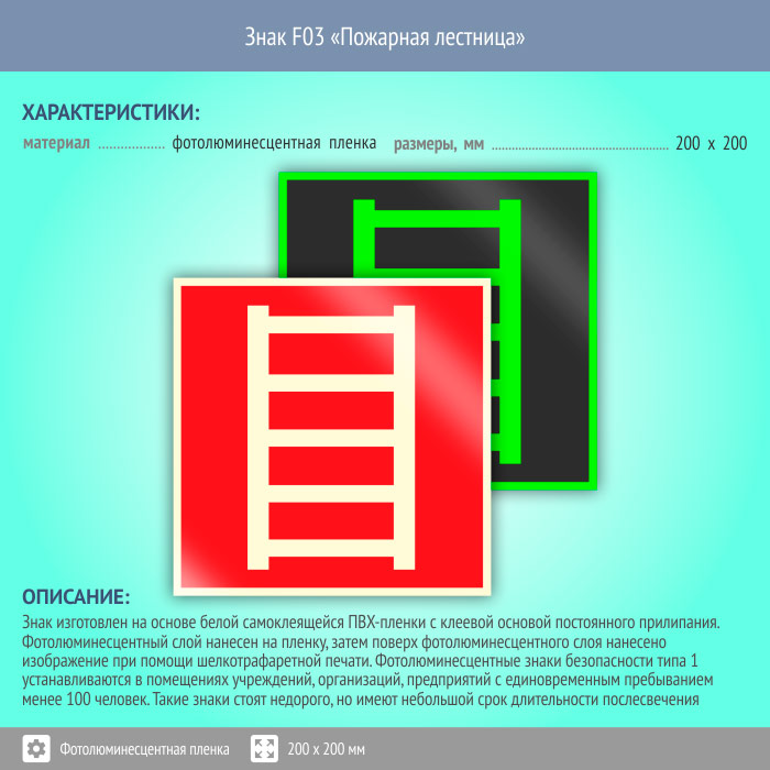 Знак F03 «Пожарная лестница» (фотолюминесцентная пленка, 200х200 мм) в Хотьково купить