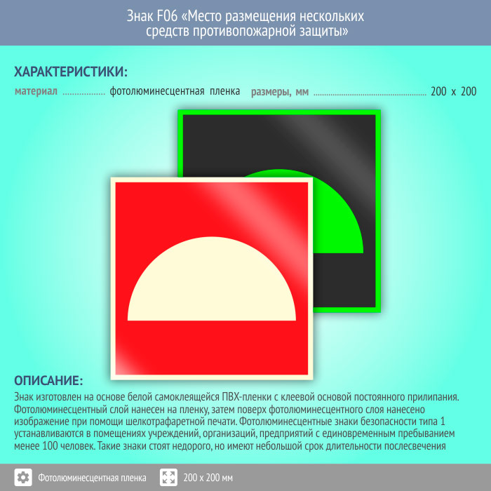 Знак F06 «Место размещения нескольких средств противопожарной защиты» (фотолюминесцентная пленка, 200х200 мм) в Хотьково купить