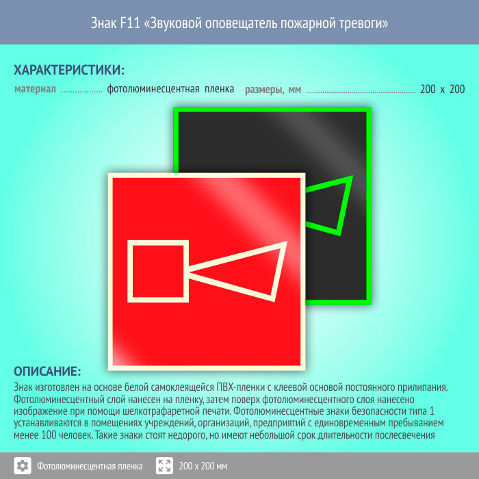 Знак F11 «Звуковой оповещатель пожарной тревоги» (фотолюминесцентная пленка, 200х200 мм) в Хотьково купить