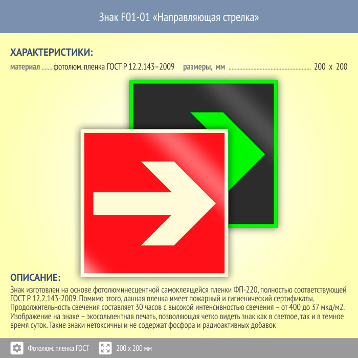 Знак F01-01 «Направляющая стрелка» (фотолюминесцентная пленка ГОСТ 34428-2018, 200х200 мм) в Хотьково купить