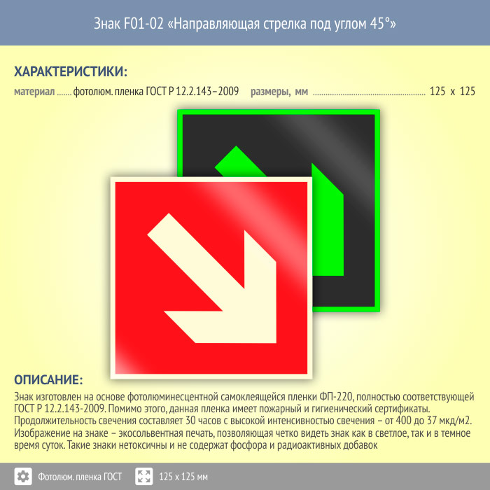 Знак F01-02 «Направляющая стрелка под углом 45°» (фотолюминесцентная пленка ГОСТ 34428-2018, 125х125 мм) в Хотьково купить
