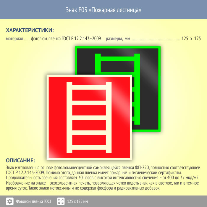 Знак F03 «Пожарная лестница» (фотолюминесцентная пленка ГОСТ 34428-2018, 125х125 мм) в Хотьково купить