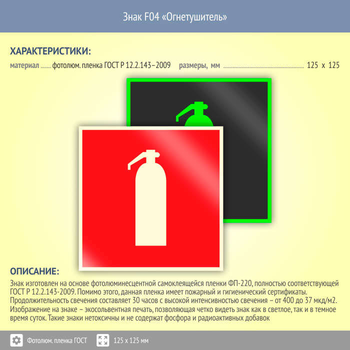 Знак F04 «Огнетушитель» (фотолюминесцентная пленка ГОСТ 34428-2018, 125х125 мм) в Хотьково купить