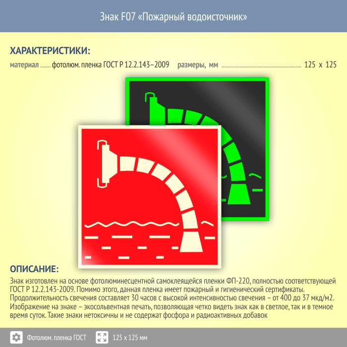 Знак F07 «Пожарный водоисточник» (фотолюминесцентная пленка ГОСТ 34428-2018, 125х125 мм) в Хотьково купить