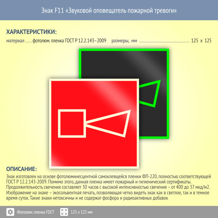 Знак F11 «Звуковой оповещатель пожарной тревоги» (фотолюминесцентная пленка ГОСТ 34428-2018, 125х125 мм) в Хотьково купить