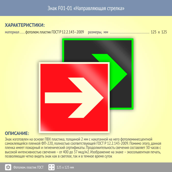 Знак F01-01 «Направляющая стрелка» (фотолюминесцентный пластик ГОСТ 34428-2018, 125х125 мм) в Хотьково купить