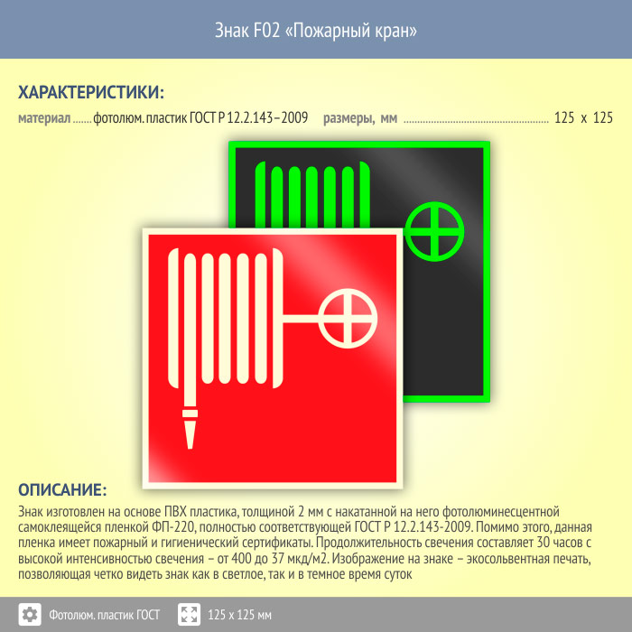Знак F02 «Пожарный кран» (фотолюминесцентный пластик ГОСТ 34428-2018, 125х125 мм) в Хотьково купить